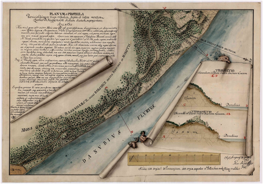 A kép bal alsó sarkában látható Basaharc, ahol az út Herculia erődje felé a hegyoldalon fut. Az ugyanott a Duna felé kiágazó út a gázlófőhöz vezet. A mellette látható kis háromszög, a két út között rejti a gázlófő településének kiterjedt temetőjét, amelyről a bizonyításban fogunk részletesen szólni. Látható, hogy az út innentől nem a parton fut, hanem felmegy a hegyre a római erődhöz, amelyet a kép felső szélén láthatunk. A parton még csak a helyenként vízben futó vontatóút létezik. Az erőd a tervrajz készítése idején, ha romokban is, de még állhatott. A sokszöget bezáró erődfalakon belül csak egyetlen épület látszik. A keresztmetszeti rajzon látszik a rom, és a rajta álló kereszt is.
